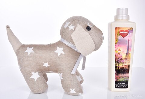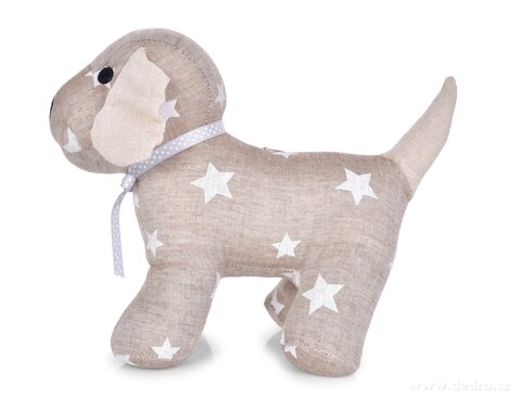 Dveřní textilní zarážka ve tvaru psa, pevné vypolstrované tělo uvnitř s kuličkami