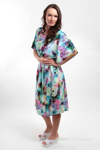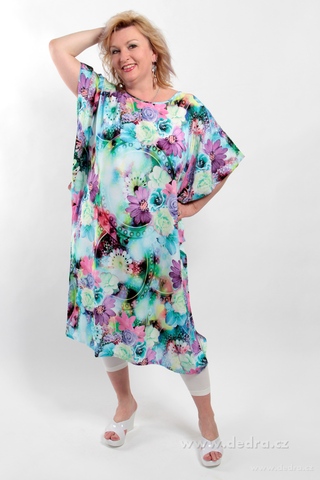 EDELIRA vzdušné šaty jednoduchého volného střihu. S netopýřími rukávy. Univerzální velikost (odpovídá L, XL, XXL, XXXL), obvod (hrudník, pas, boky) do cca 136 cm, délka cca 110 cm.