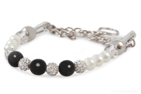 Obojek je polostahovací a je tvořen z perel, korálků a třpytivých kamínků,
