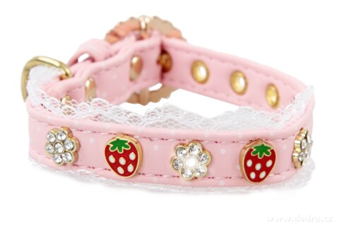 Obojek je zdoben kovovými prvky, třpitivými kamínky a jahůdkami.