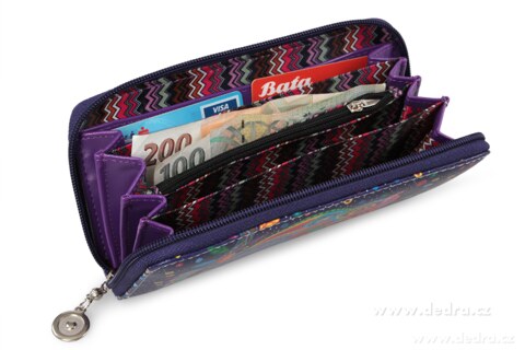 Čtyři velké kapsy na bankovky, 8 přihrádek na karty, dvě velké skryté kapsy např.