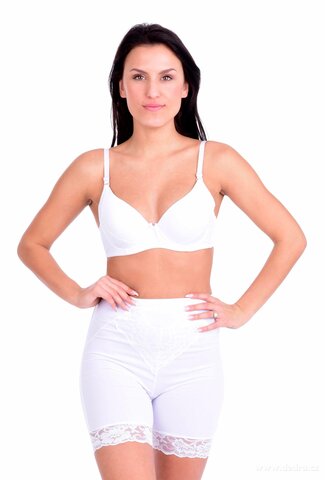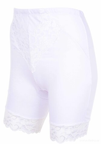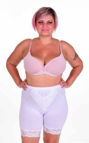 Kalhotky s nohavičkami a vyšším pasem jsou z lehkého materiálu s přídavkem bavlny pro příjemné nošení, v pase se širší gumou, aby kalhotky držely na svém místě, nohavičky jsou lemované jemnou krajkou.