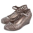 Střevíčky na klínku. Vyrobeno z kvalitního vinylu. Se třpytivým efektem, struktura působí krajkovým dojmem. Vnitřní část z měkkého příjemného materiálu, gumová podrážka. Výška klínku 5,5 cm.
