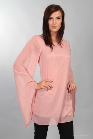 Dámská vzdušná tunika s trumpetovými rukávy. Každé postavě lichotící volný střih. Saténová neprůhledná podšívka. Rukávy jsou bez podšívky, díky tomu působí velmi vzdušně. Tuniku můžete nosit po celý rok. Materiál: 100% polyšifon. Délka ve velikosti M: cca 87 cm (»2 cm). Ve velikostech S, M, L.
