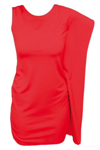 Minišaty s atypickými průramky. Jeden průramek bez rukávu, druhý volně splyvá a tvoří jeho prodlouženou délku až ke spodní části šatů. Zapínání na zip na boční straně. Stretch kvalita nabízí elasticitu a speciální vlákna vysoký komfort při nošení a tvarovou stabilitu. Podíl viskozy vyrovnává teplotu a je prodyšný. Snadná údržba bez žehlení. Korálově červená. Délka ve velikosti M: cca 86 cm. Materiál: 62% viskozové hedvábí, 32% polyester, 6% SpandexR, 330 g/m2. FC9941 + Vaše velikost (S, M, L, XL)