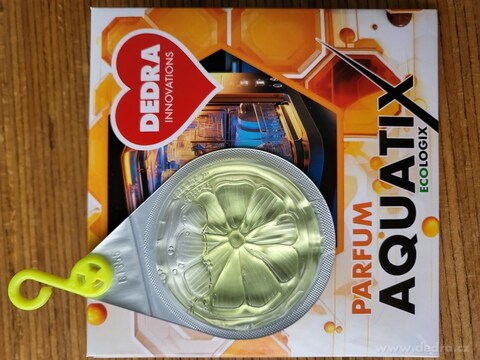 Závěsná vůně do myčky AQUATIX PARFUM neutralizuje zápach z nádobí a provoní myčku luxusní citrusovou vůní až na 50 cyklů. Jednoduché zavěšení na koš. Balení 1 ks.