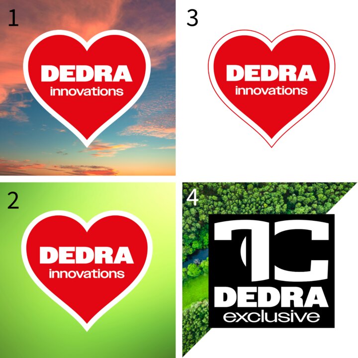 Logo Dedra Innovations s bílým okrajem je určeno pro použití na barevném pozadí (včetně fotografií). Logo s červeným okrajem je určeno pro použítí na bílém pozadí.