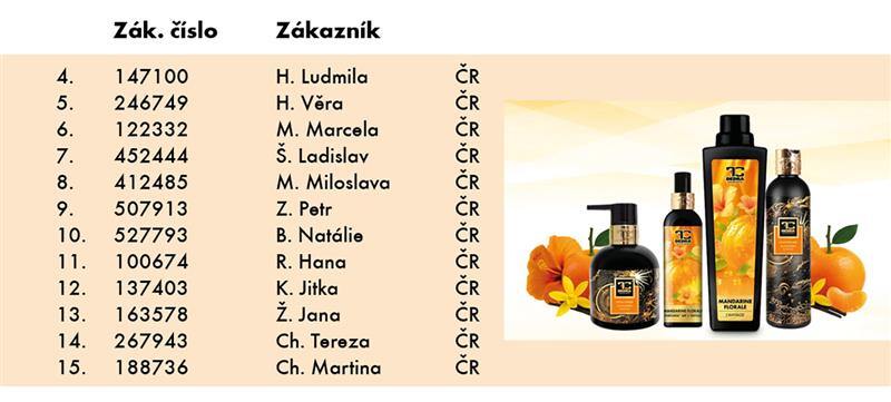 🏅4. až 15. pozice získá.......balíček 4 ks výrobků z parfemace MANDARINE FLORALE v hodnotě 636 Kč/25,56 € (každý výherce na 4.-15. místě získá ceny uvedené na následujícím obrázku).