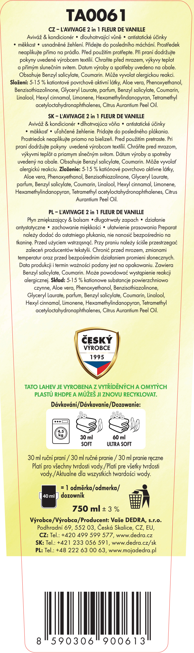 Výrobce / dovozce: Vaše Dedra s. r. o., Podhradní 69, Česká Skalice, Česká republika