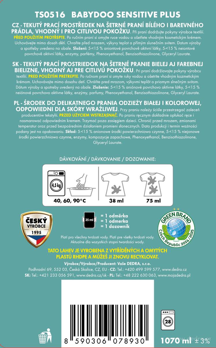 Tekutý prací prostředek na šetrné praní bílého a barevného prádla vhodný i pro citlivou pokožku, BABYDOO SENSITIVE PLUS, 2 x 1070 ml = 56 praní.