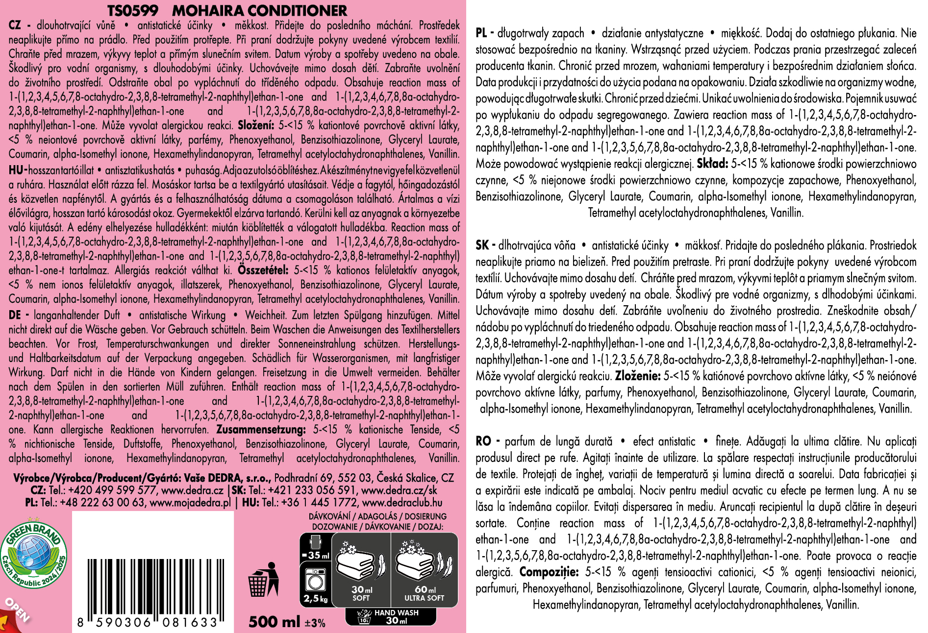Luxusní kondicionér MOHAIRA CONDITIONER pro poslední máchání jemného, pleteného a kašmírového prádla. Zjemňuje vlákna, eliminuje elektrostatický náboj a násobí vůni MOHAIRA DELICATE díky parfémovému vrstvení. Šetrný k vláknům, pokožce i přírodě.