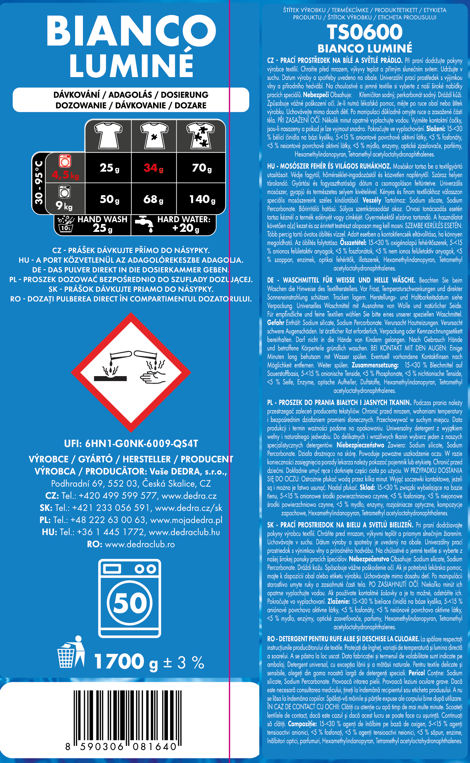 Koncentrovaný prací prášek určený pro bílé prádlo. BIANCO LUMINÉ pomáhá udržet světlost a čistý vzhled bílých textilií, pere účinně při nižším dávkování a je vhodný pro pravidelné praní.