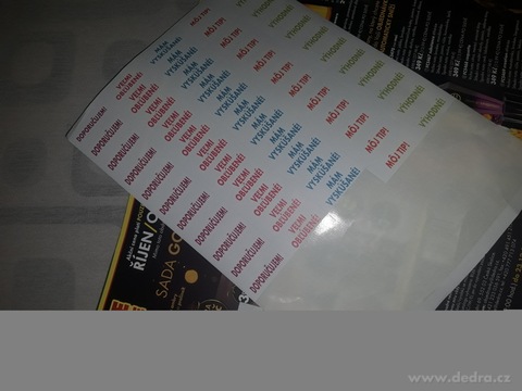 Sada 79 ks SLOVENSKÝCH samolepek na archu na značení (16x DOPORUČUJI, 16x VELMI OBLÍBENÉ!, 16x MÁM VYZKOUŠENÉ!, 16x MŮJ TIP! a 15x VÝHODNÉ!). Slouží našim prodejcům k označení produktů.