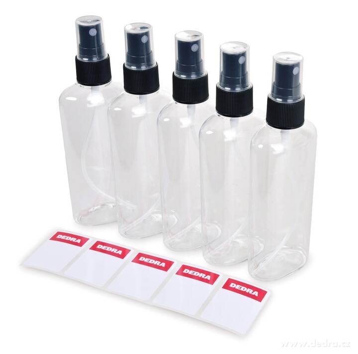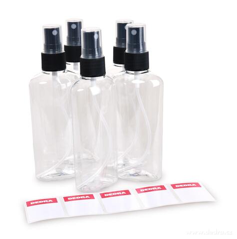 Praktická sada 5 ks lahviček o objemu 100 ml se sprejem a samolepicími štítky pro popis obsahu.