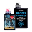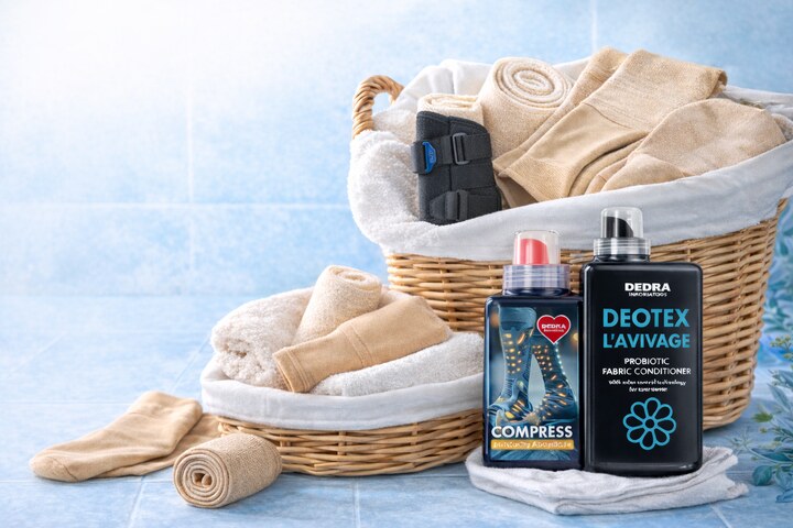 Sada 1+1 COMPRESS & DEOTEX® L’AVIVAGE je promyšlenou kombinací pracího gelu a probiotického kondicionéru, vytvořenou speciálně pro kompresní punčochy, bandáže a ortézy. Je vhodná pro textilie, které vyžadují šetrné, ale účinné praní.