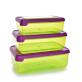 Sada 3 úsporných potravinových dóz HERMETIC SILIBOX (400 ml, 700 ml, 1100 ml) se silikonovým těsněním zajišťuje 100% těsnost. Díky pružným víčkům se snadno otevírají a boxy lze vkládat do sebe. Vhodné do myčky, mikrovlnky (bez víka), lednice i mrazničky.