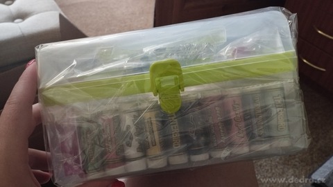 Velký šicí kufřík ŠVADLENKA s 220 šicími potřebami v plastovém boxu 21 cm. Barevné nitě, jehly, špendlíky, nůžky, knoflíky i páráček. Kompletní sada pro domácí opravy i kreativní šití.