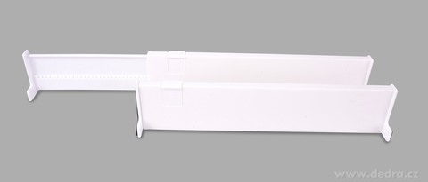 Sada 2 ks nastavitelných rozdělovačů POŘÁDKUMILOVNÍK do zásuvek 35–53 cm. Ideální na příbory, kosmetiku, kancelářské potřeby či drobnosti. Přehledný pořádek během chvilky!