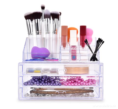 Tři prostorné zásuvky ochrání tvou kosmetiku i doplňky, zatímco horní část nabízí 16 přihrádek, kde přehledně uspořádáš rtěnky, laky na nehty, tužky nebo drobnosti. Vyroben z tvrzeného čirého plastu, který je odolný, elegantní a snadno se čistí. Hodí se do koupelny, ložnice i na toaletní stolek – a promění každodenní rutinu v radost.
