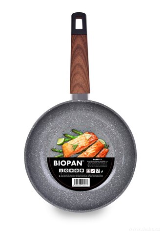 Střední BIOPAN® WOODOO pánev Ø 20 cm s objemem 1000 ml a keramickým povrchem SALT&PEPPER v imitaci kamene. Rukojeť SOFT TOUCH v imitaci dřeva, použití na všechny varné plochy včetně indukce. Bez PTFE a PFOA.