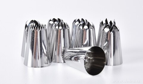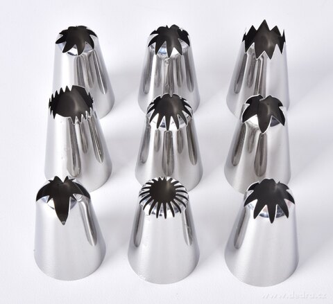 Sada 9 širokých nerezových špiček CREMO pro zdobení dortů, zákusků, cukroví i slaných dobrot. Vhodné na krémy, pomazánky i máslové náplně. Odolné a snadno čistitelné.