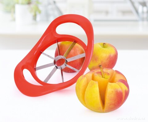 Ruční kráječ na jablka JABLKOVÝ MĚSÍČNÍK umožňuje snadno a rychle rozkrojit jablko na 8 rovnoměrných měsíčků a současně jej zbavit jadřince. Díky ostrým čepelím z nerezové oceli a pohodlným plastovým úchopům je krájení rychlé, přesné a bezpečné.