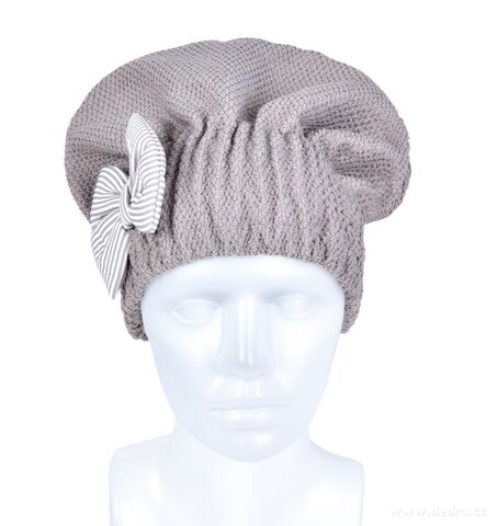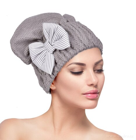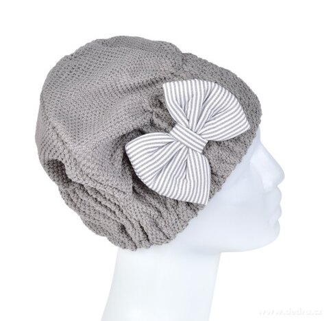 TURBAN/ČEPICE s mašlí na vysušení mokrých vlasů. Obvod cca 38 – 62 cm, výška 21 cm.