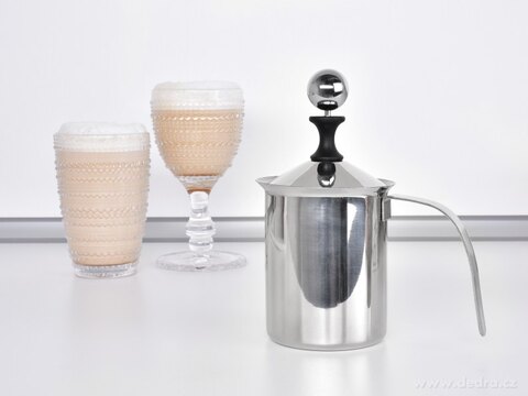 Ruční nerezový napěňovač mléka 500 ml pro přípravu bohaté pěny ze studeného i teplého mléka. Masivní provedení z kartáčované oceli s integrovaným sítkem – ideální pro domácí cappuccino či latte.