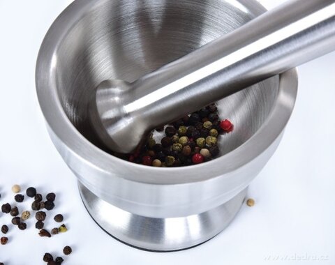 Hmoždíř „na celej život“, masivní nerezový hmoždíř s tloučkem.