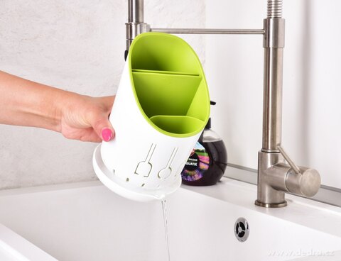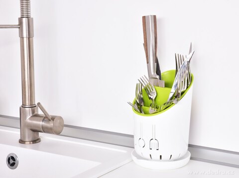 Stojan/odkapávač DRENAGE (⌀12 × 18,5 cm) s odnímatelnou vložkou a miskou na odtok vody slouží k odkapání i odkládání příborů a kuchyňského náčiní. Pevný plast, snadné čištění – praktický organizér pro každou kuchyň.