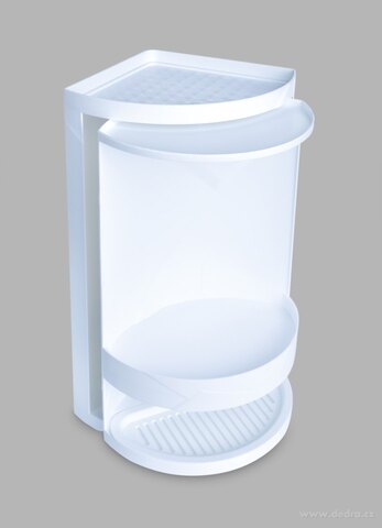 360° otočná rohová police/skříňka, vyrobena z odolného plastu. Součástí balení 2 přísavky, 2 silikonové samolepící podložky a lepidlo. Rozměry: š 25,5 x h 20,5 (otevřená 28 cm) x v 41,5 cm.