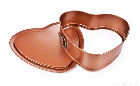 DORTOVÁ ROZKLÁDACÍ FORMA ve tvaru srdce, s kovovou přezkou pro snadné odepnutí obruče, dno s prolisem pro přenášení a servírování, z oceli se zlato měděným prémiovým nepřilnavým povrchem BIOPAN® GOLD, který se snadno udržuje a má dlouhou životnost.