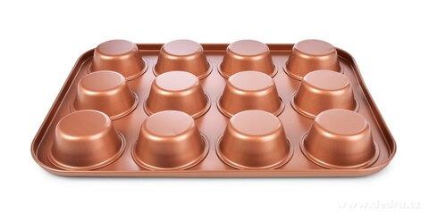 Praktická forma na 12 kusů muffinů nebo cupcakes z kvalitní oceli se zlato-měděným nepřilnavým povrchem BIOPAN® GOLD. Díky prémiové nepřilnavosti snadno vyjmete hotové dobroty a forma se rychle čistí. Ideální pro sladké i slané muffiny, mini cheesecaky nebo slané bábovičky.