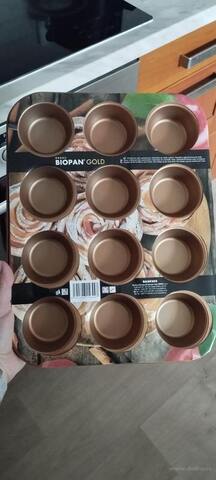 BIOPAN® GOLD forma na 12 muffinů a cupcakes 35 × 27 cm s nepřilnavým povrchem pro snadné vyklopení a snadnou údržbu. Ideální pro sladké i slané muffiny, mini dezerty nebo bábovičky. Odolná, bez PFAS, vhodná do všech typů trub.