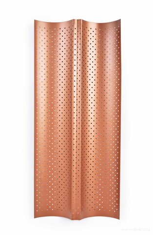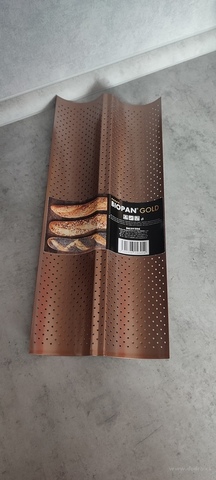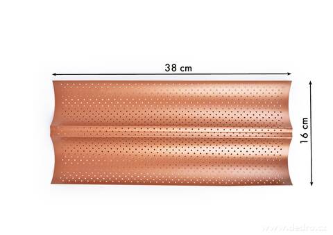 BIOPAN® GOLD perforovaná forma na 2 bagety 38 cm s nepřilnavým povrchem pro rovnoměrné propečení a křupavou kůrku. Prohnutý tvar udržuje bagety v ideální poloze. Snadné čištění, bez PFAS, vhodná do všech typů trub.