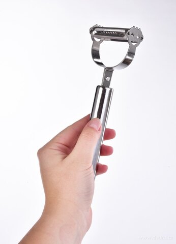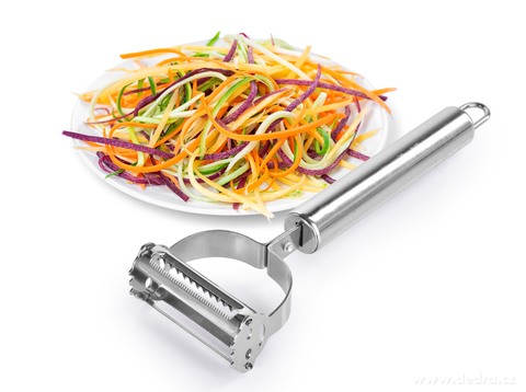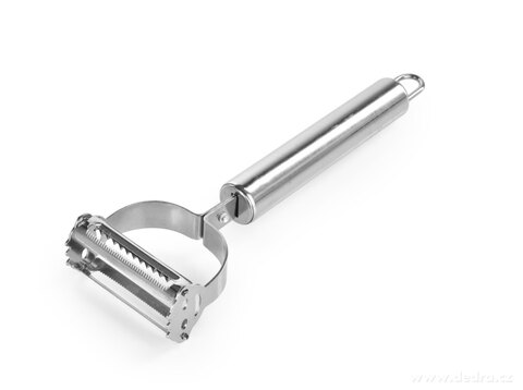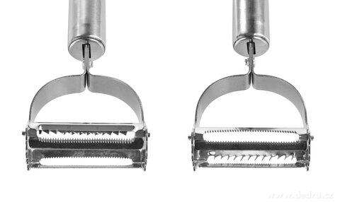Profesionální nerezová škrabka GOURMET 2v1 s dvěma pilkovými čepelemi o délce 5 cm je ideální pro rychlé loupání měkkých plodů se slabou slupkou, jako jsou rajčata, broskve, kiwi nebo švestky. Oboustranné provedení umožňuje pohodlné použití pro praváky i leváky a zároveň prodlužuje životnost nástroje.