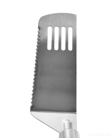 Elegantní nerezová krájecí lopatka GOURMET s ostrým vroubkováním pro snadné krájení a servírování dezertů i sýrů. Lesklá ocel, profi kvalita a očko na zavěšení.