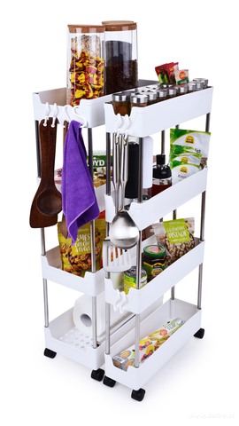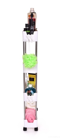 Pojízdný regál do úzkých prostor se 4 odnímatelnými háčky na pověšení a 4 pojezdovými kolečky pro snadnou manipulaci. Kombinace kovu a plastu. Hloubka 39 cm, 4 patrový.