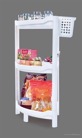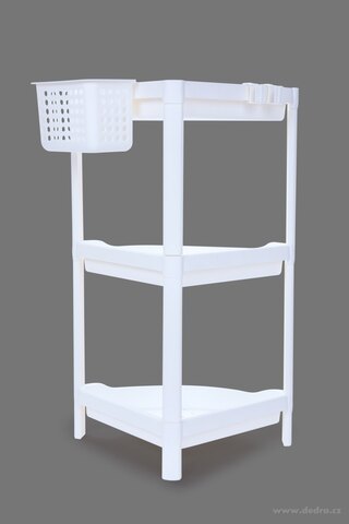 Třípatrový rohový regál výšky 70 cm s perforovanými policemi, závěsným košíkem a háčky. Praktický organizér do koupelny, kuchyně i dětského pokoje pro přehledné uložení věcí.