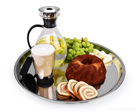 Masivní kulatý nerezový tác (45 cm) pro elegantní servírování dortů, chlebíčků, ovoce či dezertů. Odolný, lesklý, vhodný pro každodenní i slavnostní stolování.