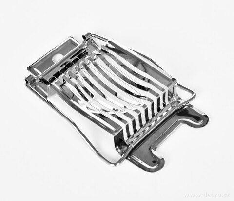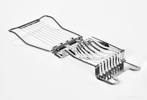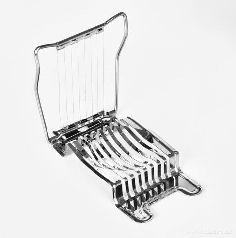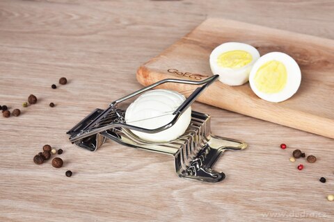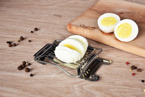 EGGY je masivní kráječ na vajíčka z nerezové oceli, který jedním plynulým pohybem naporcuje vejce až na 8 rovnoměrných plátků. Ostré nerezové struny zajišťují hladký řez bez drcení žloutku, takže plátky mají vždy perfektní tvar.