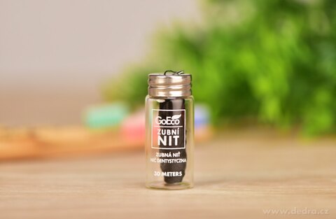 Ekologická zubní nit GoEco® z bambusového vlákna s aktivním bambusovým uhlím a jemným mentolovým nádechem. 30 m návinu ve skleněné dózičce s kovovým víčkem a praktickým břitem. 100% přírodní, šetrná a odolná.