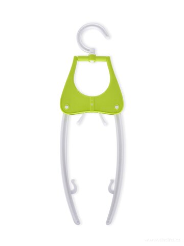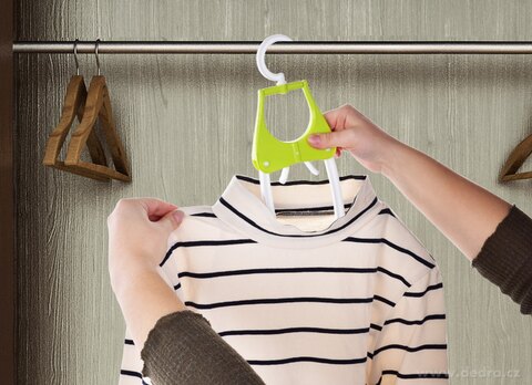 Sada 5 skládacích ramínek GENIUS chrání výstřihy před vytaháním. Po stisknutí se ramínko složí a lze ho vytáhnout úzkým výstřihem bez rozepínání. Ideální pro svetry, roláky a halenky. Otočný háček, očko na šátky a boční háčky na poutka. Rozměry 43,5 cm (složené 10 cm).