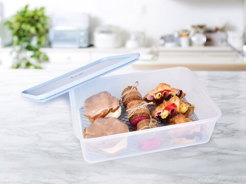 Dóza HERMETIC FRESH (4,2 L) je vybavena odkapávací/prodyšnou mřížkou, která umožňuje volnou cirkulaci vzduchu a udržuje potraviny při skladování v suchu a déle čerstvé. Díky ventilu ve víku a silikonovému těsnění je dóza vzduchotěsná a vodotěsná, takže ochrání obsah před vlhkostí, vysycháním i znehodnocením. Perfektní pro uchování salámů, sýrů, salátů, bylinek, dezertů, chlebíčků či jednohubek.