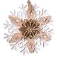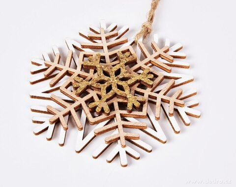 Dřevěná vánoční ozdoba ve tvaru 3D vločky s třpytivou zlatou vločkou uprostřed. Elegantní přírodní dekorace o průměru 9 cm je ideální na stromek, větvičky či do svátečních aranžmá.