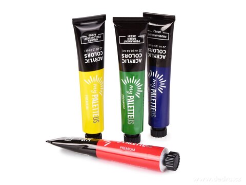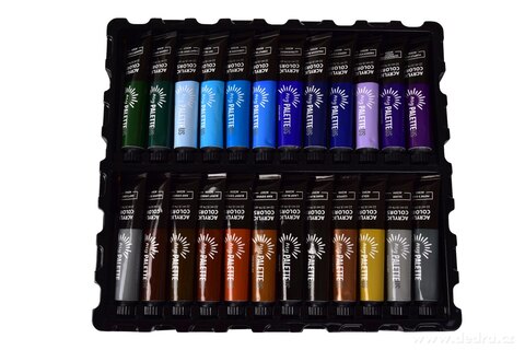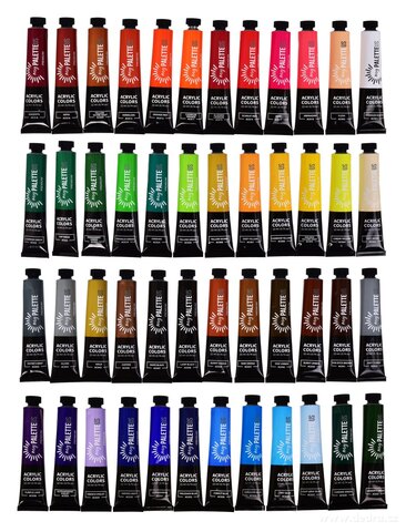 48 ks XXXL EXKLUZIVNÍ SADA farbek farbek s příslušenstvím, v hliníkových tubách, na vodní bázi, netoxické, rychleschnoucí. Součástí balení je 6 štětců různých velikostí, 1 plastová paleta na míchání barev. Baleno v pevné kartonové krabici. Objem jedné tuby je 22 ml. Rozměry balení: š 29 x h 26 x v 6 cm.