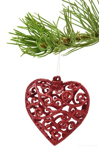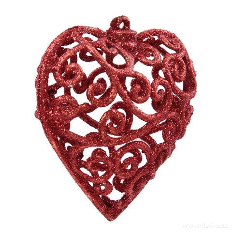 Sada 3 červených třpytivých srdíček s krajkovým vzorem o výšce 7 cm. Lehká vánoční dekorace z plastu, která vnese do vaší výzdoby romantiku, eleganci a sváteční kouzlo.