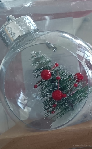 Každá průhledná koule ukrývá malý zasněžený stromek s červenými detaily, připomínajícími bobule v mrazivém lese. Efekt imitace sněhu dodává dekoraci jiskřivou čistotu a vyvolává pocit, že se díváte na pohádkovou miniaturu přírody uvězněnou v křišťálové kouli.
