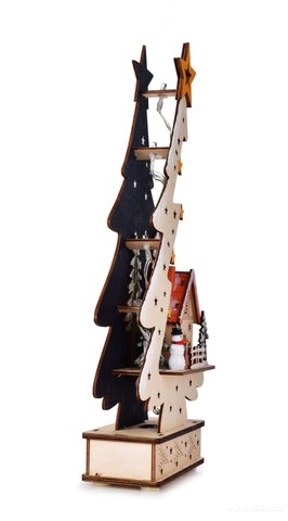 Dřevěná dekorace ve tvaru vánočního stromku skrývá zasněženou chaloupku, sněhuláka a svítící LED osvětlení. Výška 40 cm. Jemné detaily a přírodní provedení přinášejí do domova harmonii a atmosféru tradičních Vánoc.