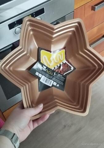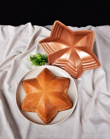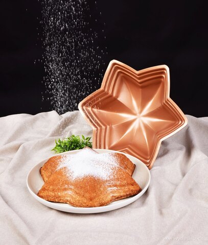 Forma BIOPAN® GOLD ve tvaru hvězdy Ø 32 cm s prémiovým nepřilnavým povrchem pro snadné pečení i vyjmutí dezertů. Vhodná na dorty, koláče, bábovky i slané pokrmy. Odolná, snadno se čistí, bez PFAS, do všech typů trub.